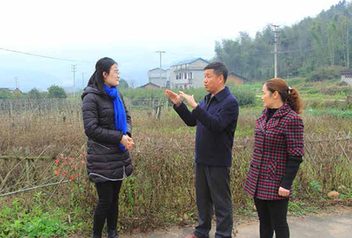 林善平代表(中)走訪回鄉的大學畢業生施穎( 左一),鼓勵她扎根山區,為山區發展貢獻聰明才智。攝影/ 王爭