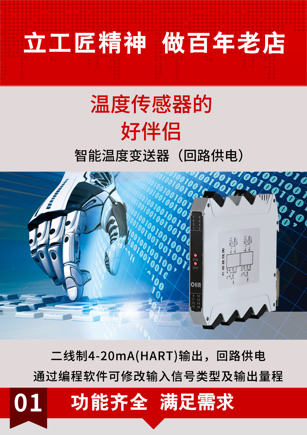 回路供電溫度變送器分為M213智能溫度變送器、M214隔離智能溫度變送器、M215 HART智能溫度變送器,變送器將現(xiàn)場的熱電阻或熱電偶信號經(jīng)過隔離放大處理,轉(zhuǎn)換為與溫度成線性的二線制4-20mA(HART)信號輸出至控制系統(tǒng)。