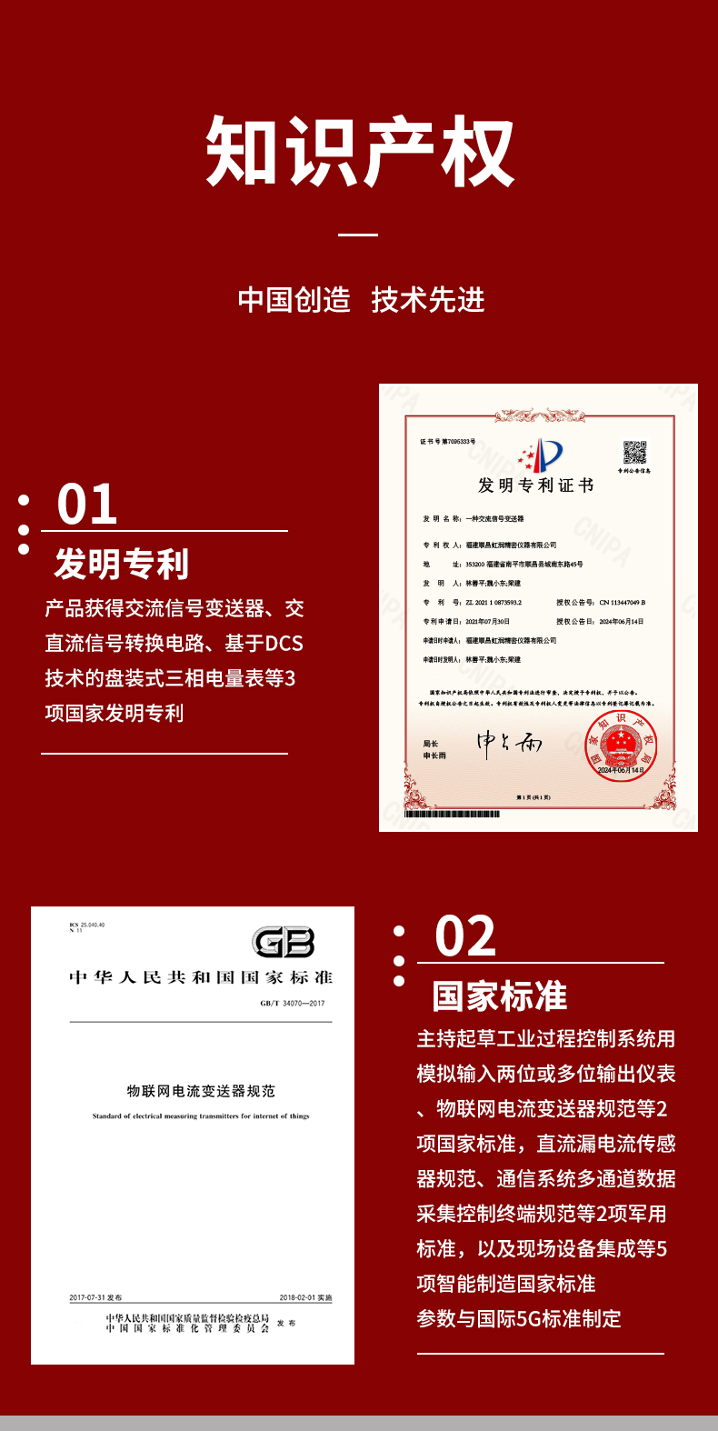 虹潤公司是專業生產電流傳感器的國家專精特新“小巨人”企業。生產的交流電壓/電流變送器,具有交流電壓/電流輸入、高精準測量、響應速度快、高抗干擾、全隔離設計等特點。產品獲得一種交流信號變送器、交直流信號轉換電路、基于DCS技術的盤裝式三相電量表等3項國家發明專利,主持起草工業過程控制系統用模擬輸入兩位或多位輸出儀表國家標準,直流漏電流傳感器規范、通信系統多通道數據采集控制終端規范等2項軍用標準,以及現場設備集成等5項智能制造國家標準,參與國際5G標準制定。產品廣泛應用于工業自動化、電力、新能源、科研實驗基礎設施等需要電力參數監測的領域。