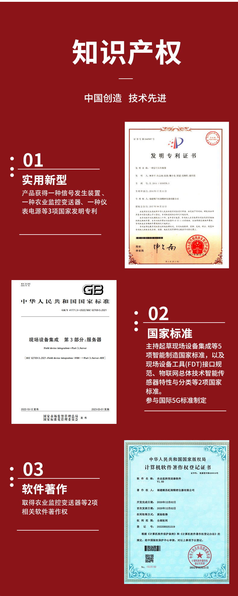 虹潤公司是專業生產環境監測儀表的國家專精特新“小巨人”企業。生產的氧氣變送器,具有采用電化學原理,響應靈敏,準確度高,低功耗,模擬量變送輸出或RS485通訊等特點。產品獲得一種農業監控變送器、一種儀表電源等2項實用新型專利,主持起草現場設備集成等5項智能制造國家標準,以及現場設備工具(FDT)接口規范、物聯網總體技術智能傳感器特性與分類等2項國家標準,參與國際5G標準制定,取得農業監控變送器等3項相關軟件著作權。產品廣泛應用于機房、配電站、地下車庫、工廠倉庫、食品儲存、養殖場、果蔬林園等環境場合對氧氣濃度的檢測。